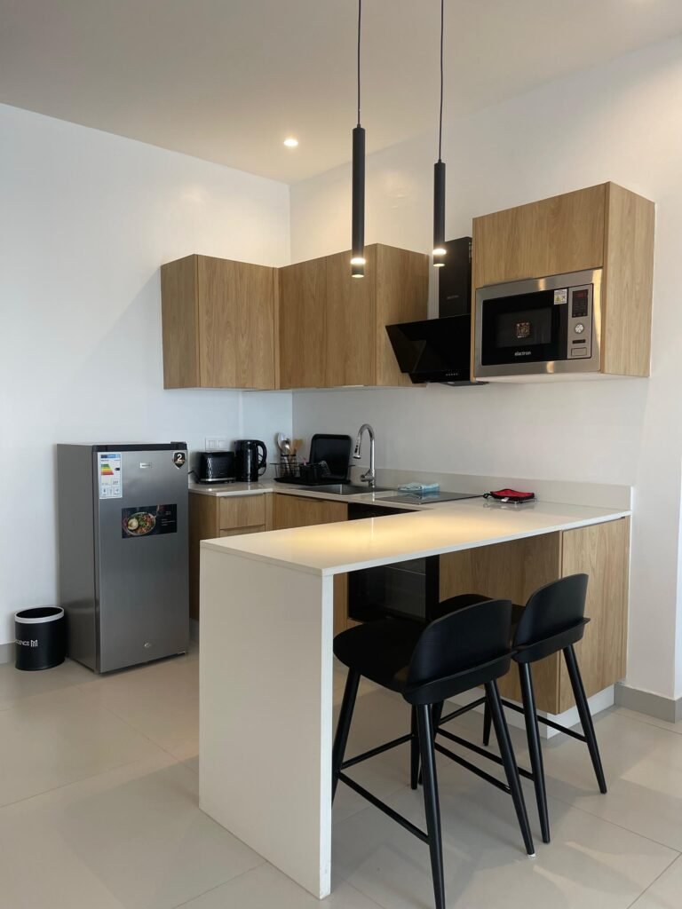 Cuisine américaine entièrement équipée (frigo, plaques, micro-ondes, vaisselle…)